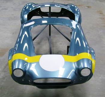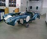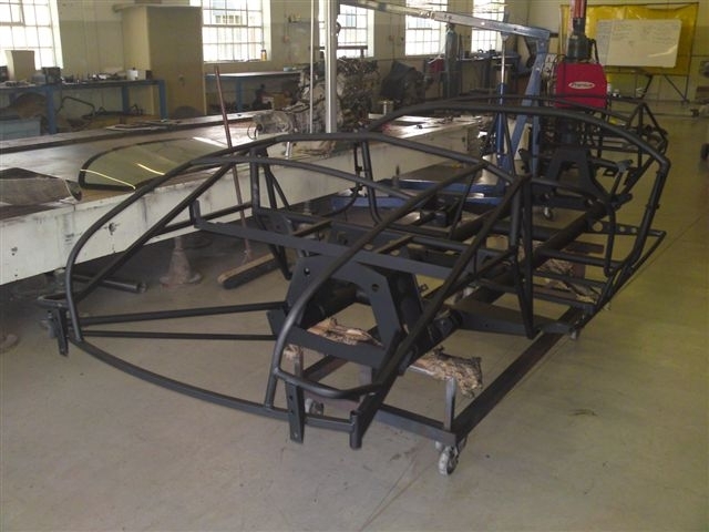 The John Tojeiro designed 3” tubular rail and cross member ladder style chassis, with front and rear suspension towers welded to it, started off life under a Cliff Davis 2-liter special in 1953. The little red Ferrari 166 barchetta look-a-like body placed on top of this chassis proved to be a formidable force in the local club racing events... so much so that AC cars decided to buy the design when it was offered to them. . The chassis was also tweaked by Alan Turner at the AC cars factory. Heavier gauge tubing with extra cross bracing was used and because the rear brakes had been moved from inboard to outboard, the differential area could be modified and strengthened as well. The first 126 frames used the same front suspension tower as the Ace but when the change to rack and pinion steering took place, a different type of front shock tower was used. This allowed for further strengthening.